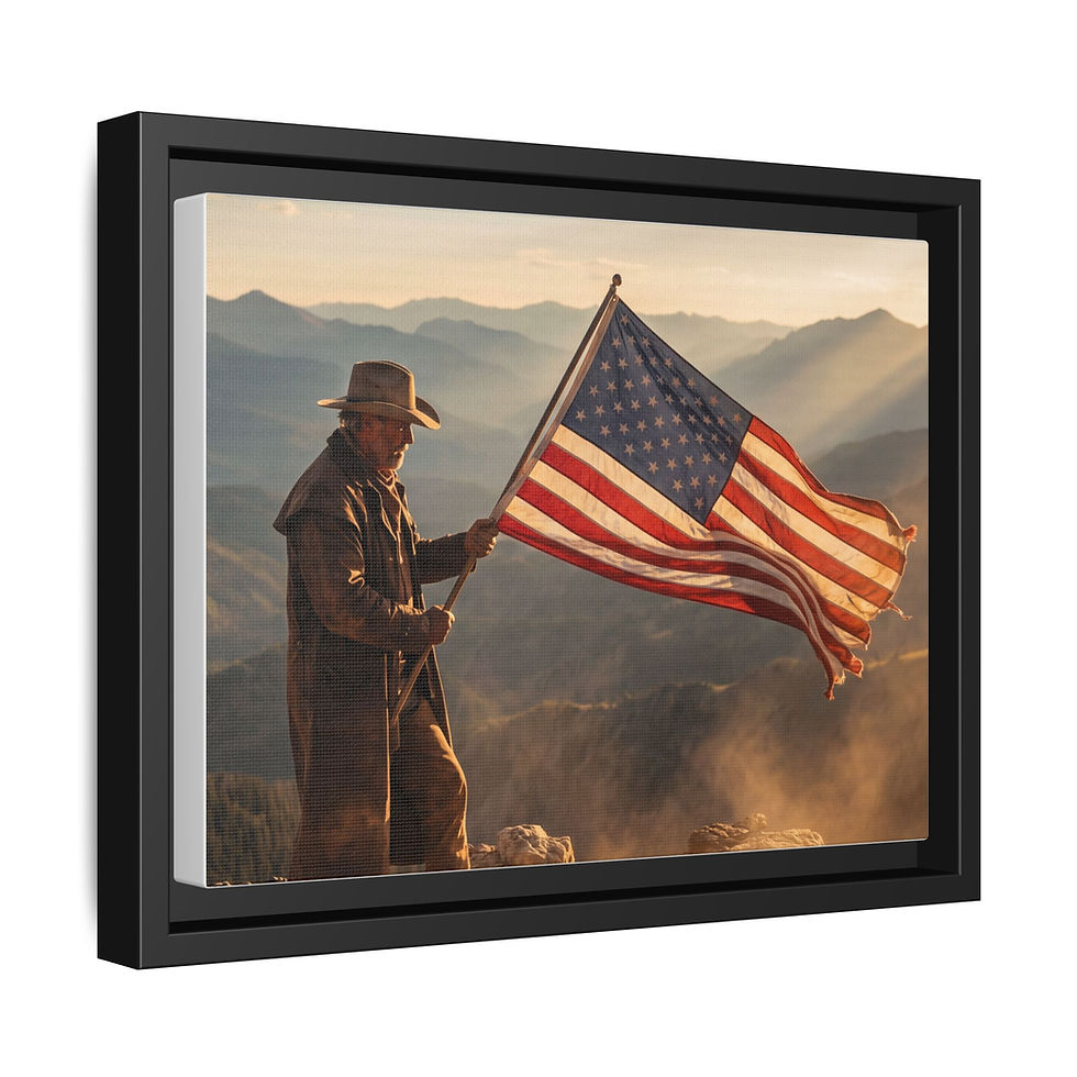 Pioneer Wagon Trail with American Flag Matte Canvas Framed